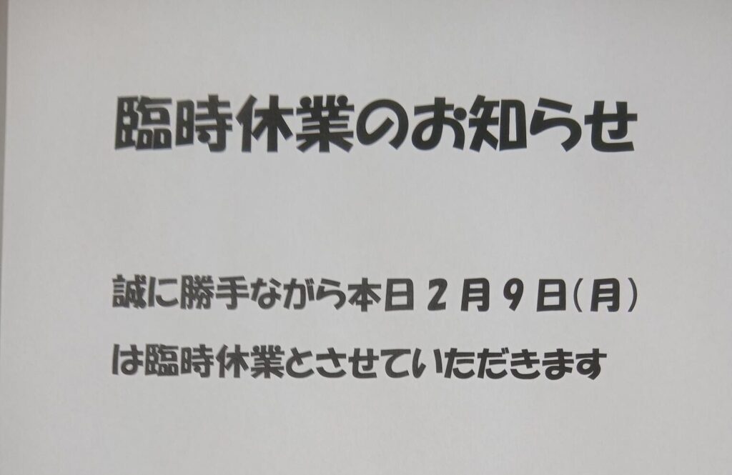 臨時休業のお知らせ誠に勝手ながら本日2月9日(月)は臨時休業とさせていただきま... -