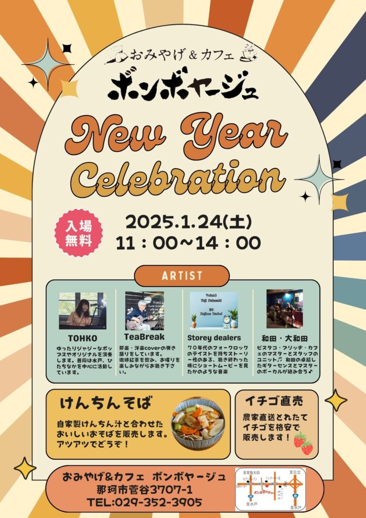新年一発目のイベントを1月24日(土)に開催決定しました!4バンド出演、あつあつけんちんそば、とれたていちごを格安販売いたします。入場無料です。ご家族・ご友人と、ぜひお気軽にお越しくださいませ。スタッフ一同お待ちしております。 お知らせ 1月24日(土)New Year Festival開催決定! 1月24日(土)11:00スタートのイベント、New Year Celebrationの出演者紹介