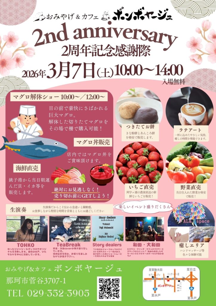 来月ボンボヤージュは2周年を迎えます。これを記念して一大イベントを開催いたします。目玉はマグロ解体ショー!解体したマグロをその場で柵にして格安で販売します。そのほか4バンドが出演する生演奏、つきたてお餅販売、ハンドマッサージ等の体験ブース、ラテアートなど盛りだくさん!楽しい時間がお過ごしいただけます。是非遊びにお越しくださいませ。